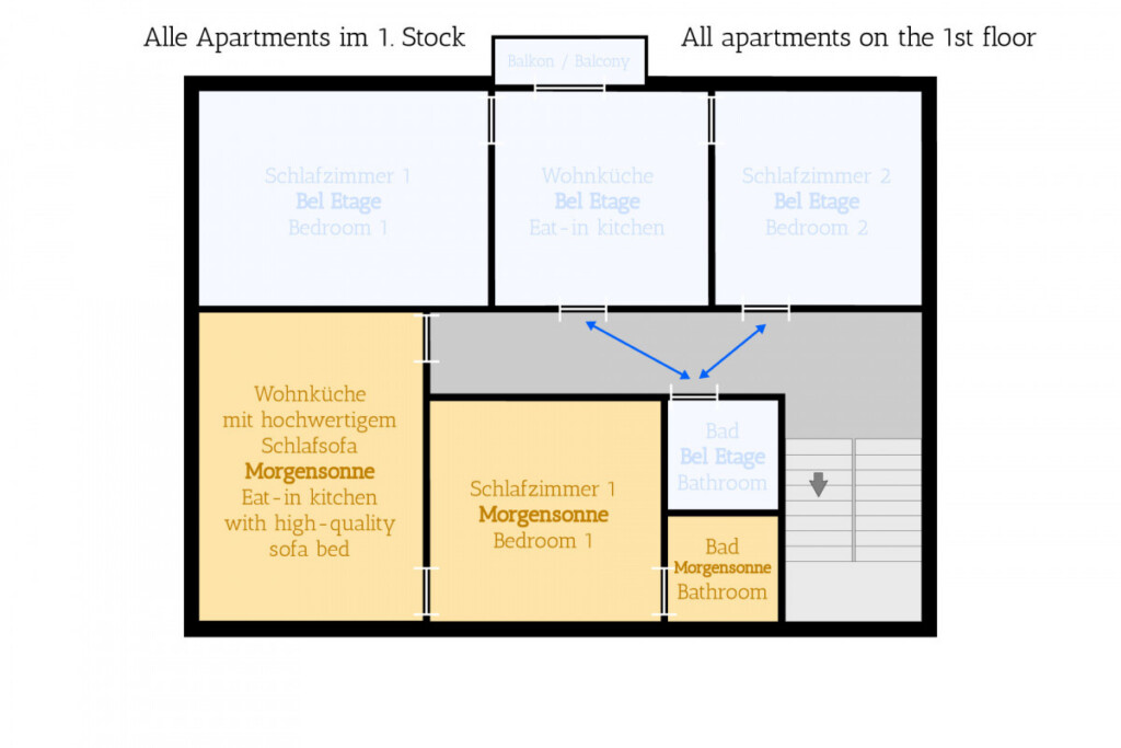 Unsere große und helle 2-Zimmer Suite befindet sich im 1.OG und bietet viel Raum für bis zu 4 Personen. Diese besteht aus einem stillvoll eingerichteten Retro-Wohnzimmer, ausgestattet mit einem neuen Boxspring-Schlafsofa (1,60×2 m Liegefläche), einem original 70er Designer Retro-Tisch mit 4 Stühlen, voll ausgestatteter Küche sowie einem neuen TV-Gerät.